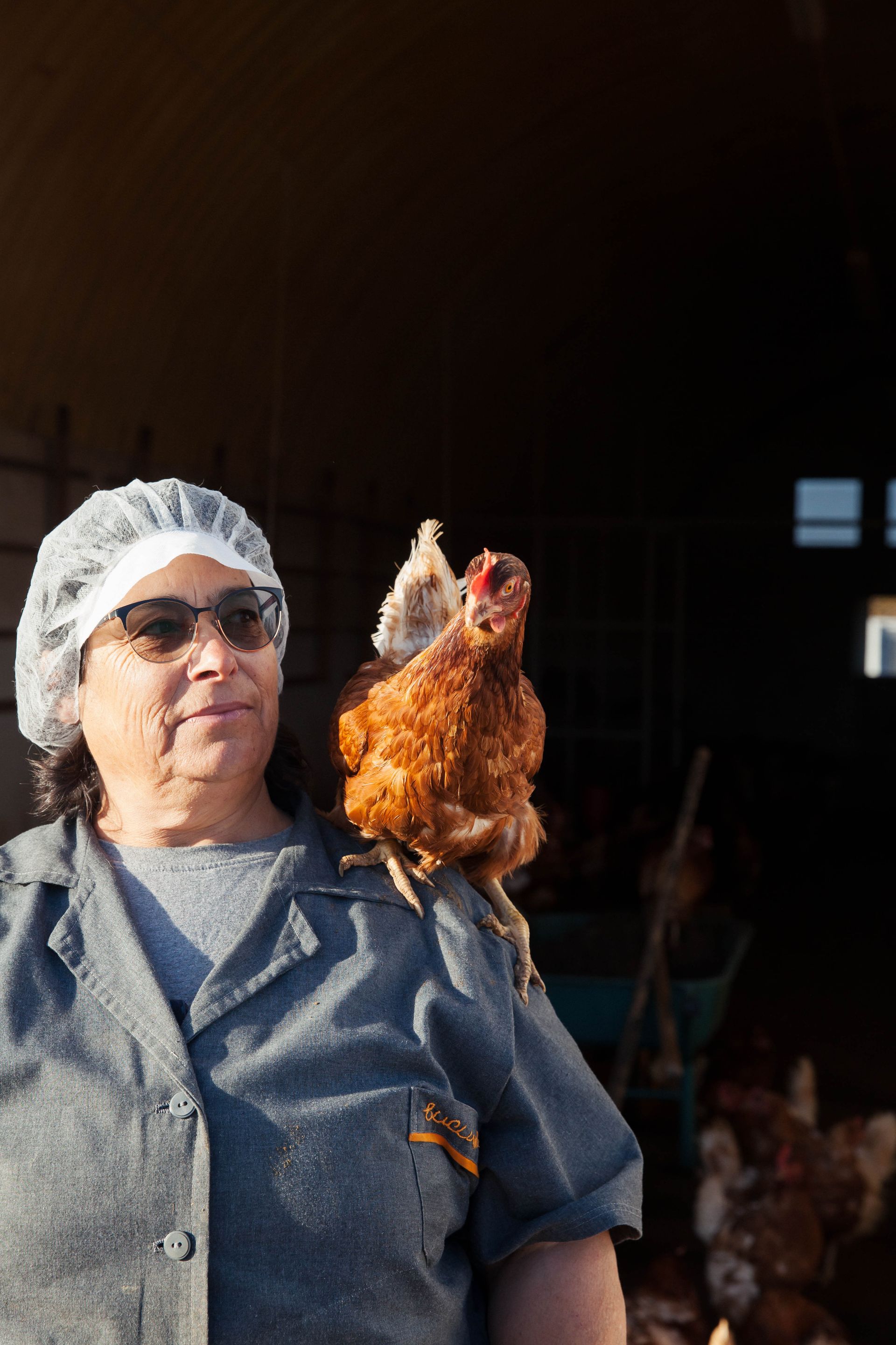 In the chicken coop, near the greenhouse, you'll find our chickens lovingly cared for by D. Custódia.